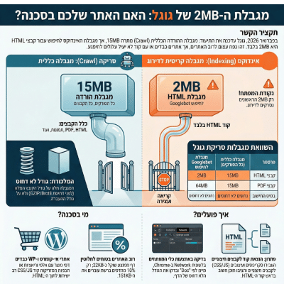 העדכון של גוגל למגבלות הסריקה הוא בעיקר הבהרת תיעוד ולא שינוי דרמטי בהתנהגות. המגבלה של 2MB לקבצי HTML בחיפוש גוגל ככל הנראה הייתה קיימת מזה שנים, וגוגל פשוט תיעדה אותה בצורה מדויקת יותר. עבור הרוב המוחלט של אתרי האינטרנט, שבהם קובץ ה-HTML שוקל עשרות קילובייטים בלבד, אין כל סיבה לדאגה.