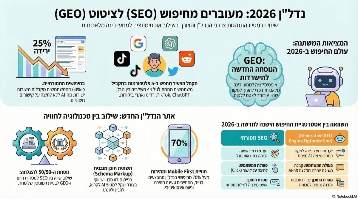 בשוק הנדל”ן הישראלי של 2026, הלקוחות שלכם כבר לא רק “מחפשים בגוגל”. הם שואלים את ChatGPT, מקבלים תשובות מ-Gemini, ומבקשים המלצות מ-Perplexity – הרבה לפני שהם מרימים טלפון. אתר מקצועי היום צריך לעבוד בשני עולמות במקביל: גם להופיע בתוצאות החיפוש המסורתיות, וגם להיות המקור שמנועי ה-AI מצטטים כשלקוח שואל “איפה כדאי לקנות דירה בתל אביב?”